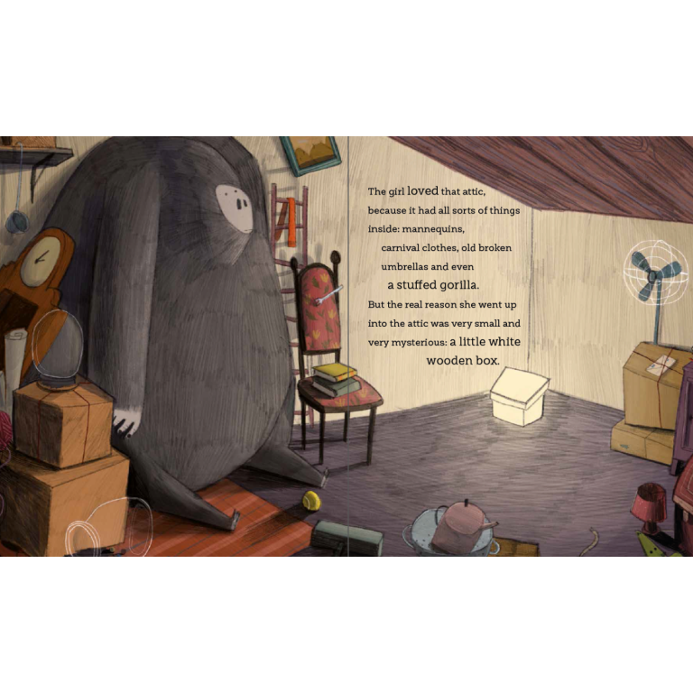 The little girl loved her grandma's attic because it held everything: mannequins, carnival costumes, broken umbrellas, and even a stuffed gorilla. But the reason she went up there was very small and mysterious: a little white wooden box. Whenever the girl picked it up, she heard a very peculiar sound coming from inside...