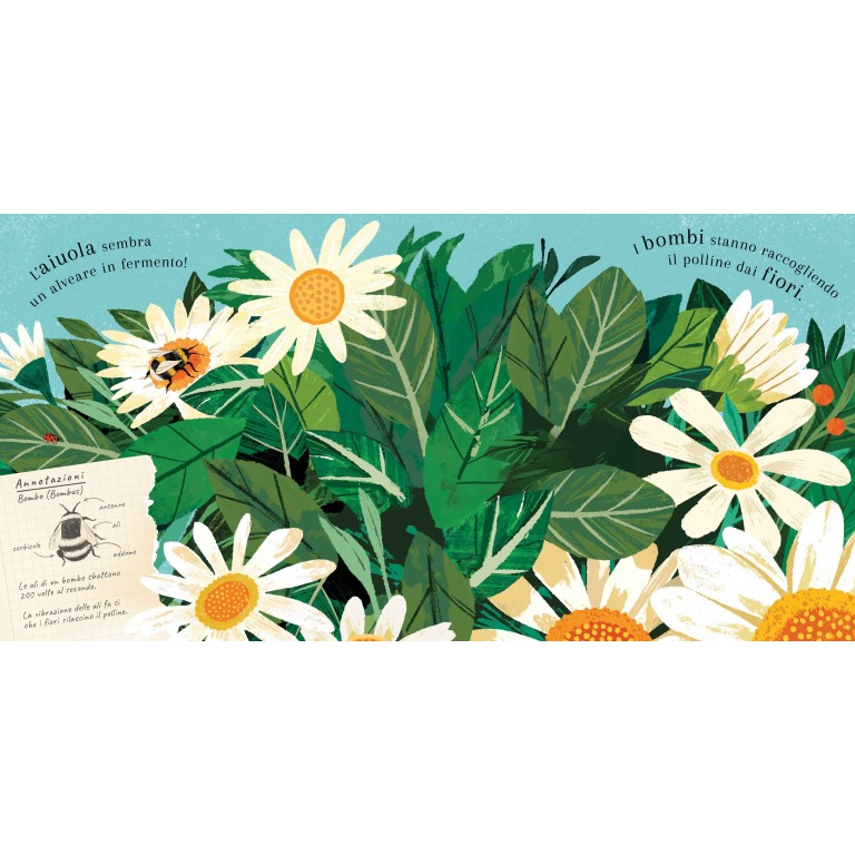 Un’avventura tra prati, aiuole e stagni che unisce meraviglia e conoscenza, stimolando l’osservazione e l’amore per la natura fin da piccoli. Ogni apertura del libro rivela un piccolo ecosistema brulicante di vita, con dettagli da osservare e scoprire. Testi brevi e informativi accompagnano le illustrazioni, aiutando i bambini a conoscere il mondo degli insetti in modo divertente e coinvolgente.