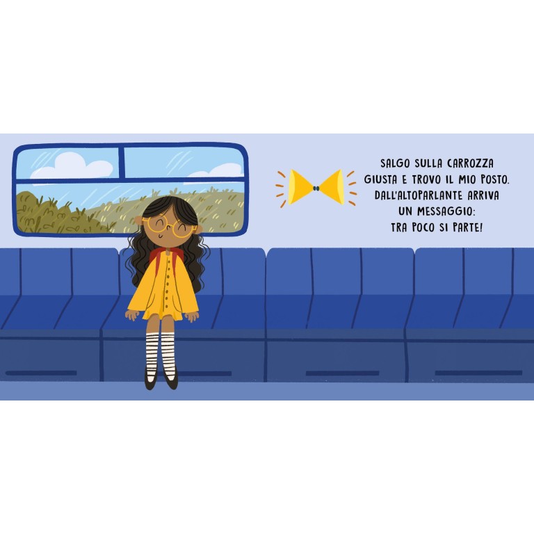 Quanti rumori alla stazione dei treni! Il capotreno fischia e, al passaggio del treno, l’aria si sposta per la grande velocità. E una volta a bordo, dall’altoparlante arriva un avviso di partenza mentre tanti bimbi corrono felici lungo i corridoi.