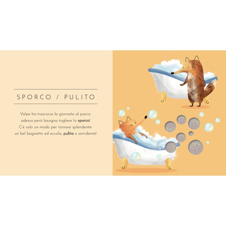 Grande-piccolo, sporco-pulito, vuoto-pieno… scopri tutti i concetti degli opposti seguendo le avventure della piccola volpe protagonista! Ogni pagina racchiude una sorpresa: un inserto di diverso materiale per sperimentare il mondo attraverso il tatto.
