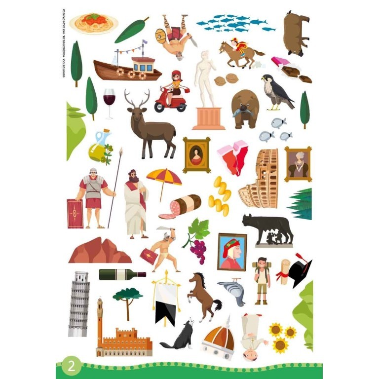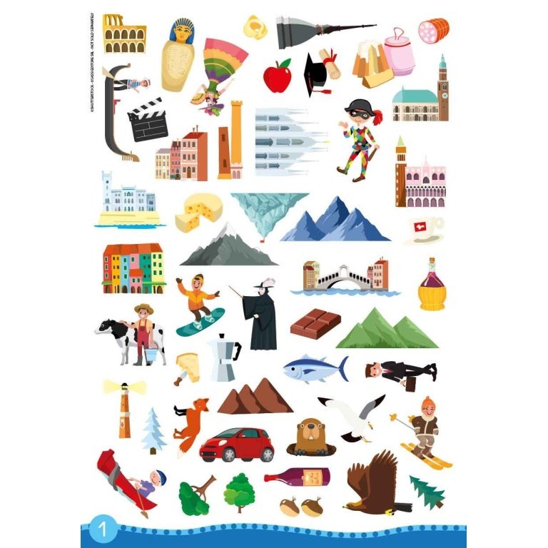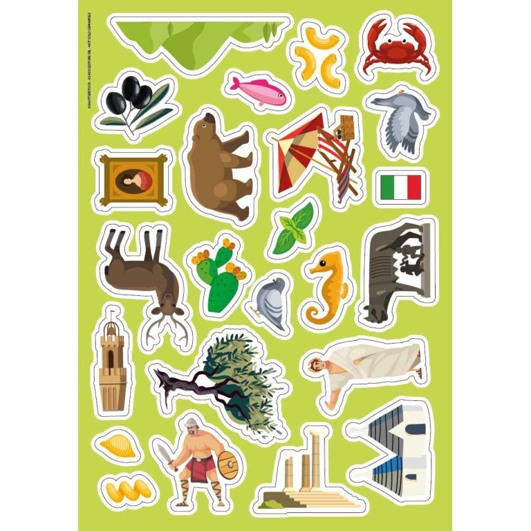 Un kit di adesivi, decalcomanie e un libro di 32 pagine per scoprire tutti i segreti dell'Italia in modo divertente e simpatico.
