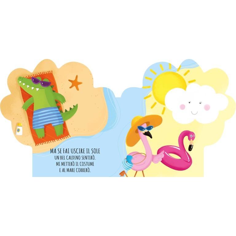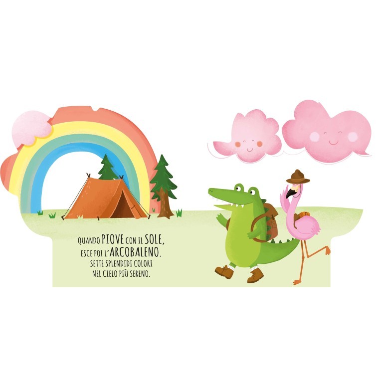 Un coloratissimo libro sagomato in rima, con cui i bambini imparano a osservare i cambiamenti del tempo e a riconoscere gli effetti della pioggia, del sole, della neve e dell’arcobaleno.
