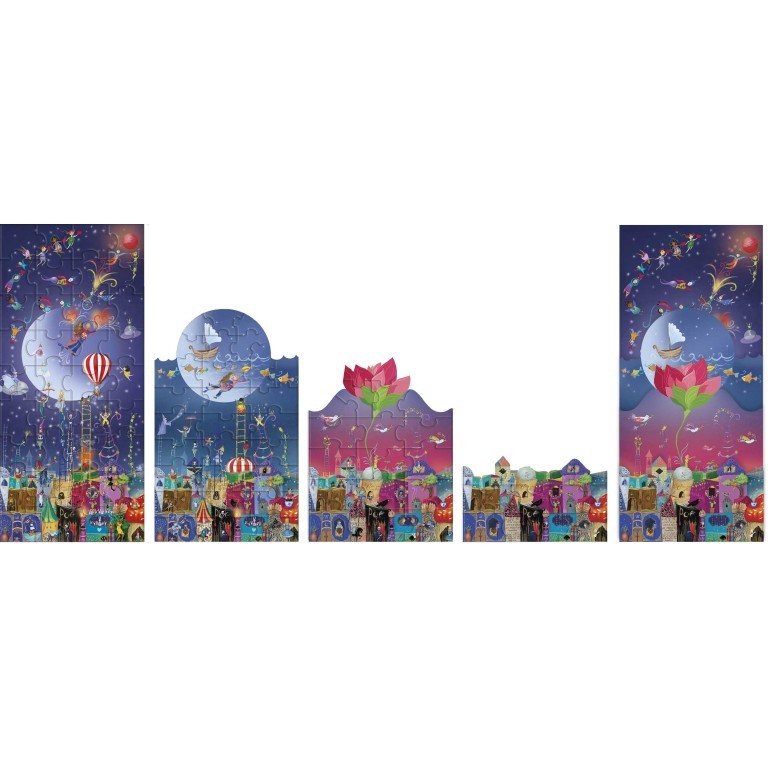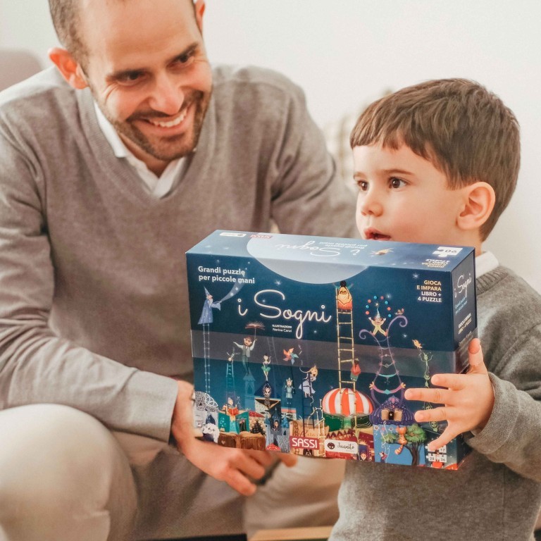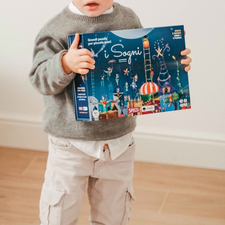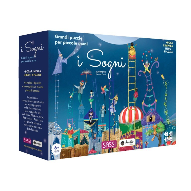 Componi i 4 puzzle da sovrapporre e divertiti a leggere il libro dedicato ai sogni e alle avventure nel mondo della fantasia, dove ogni cosa è possibile!