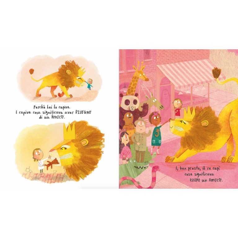 Re Leone vuole un amico. Ma come può farsi degli amici se tutti, nel suo regno, paura di lui? Triste e solo, il re ruggisce di dolore nel buio di ogni notte. Finché, un giorno, una bambina sente il suo richiamo e compie un gesto di grande coraggio: senza lasciarsi spaventare dall’aspetto del leone, cerca di comprendere e accogliere il suo punto di vista.