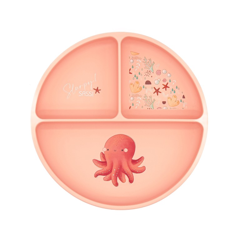 Piatto in silicone per lo svezzamento dotato di ventosa e decorato con l'intraprendente polpo Slurpy.