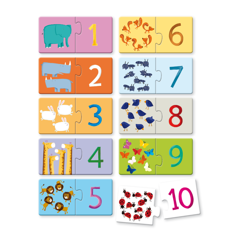 Impara i numeri con la nuova edizione della fortunata collana Puzzle 2! Leggi il libretto, impara a contare assemblando le 10 coppie di mini-puzzle.