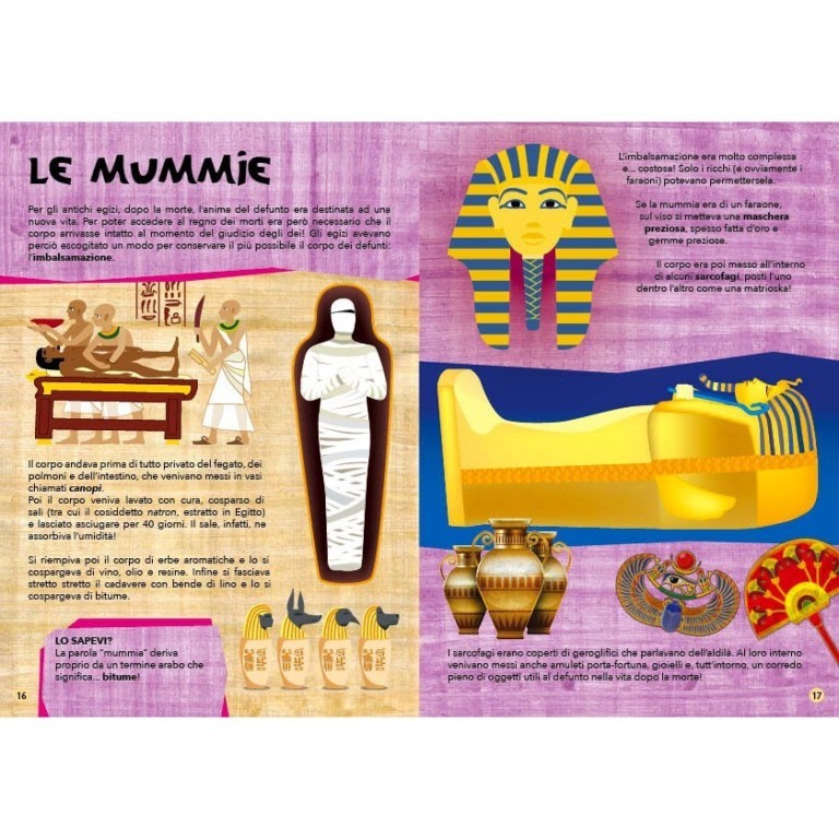 Parti per un emozionante viaggio lungo il Nilo per scoprire tutti i segreti dell'antico Egitto! Guarda quanto è alta la piramide di Cheope, riconosci i geroglifici, esplora le antiche tombe dei faraoni, scopri la vita quotidiana all'ombra della misteriosa Sfinge! Lasciati stupire da un mondo affascinante tra le sabbie del deserto! Com'è fatta una mummia? Come si vestivano gli antichi egizi? Quali erano le loro antiche leggende?