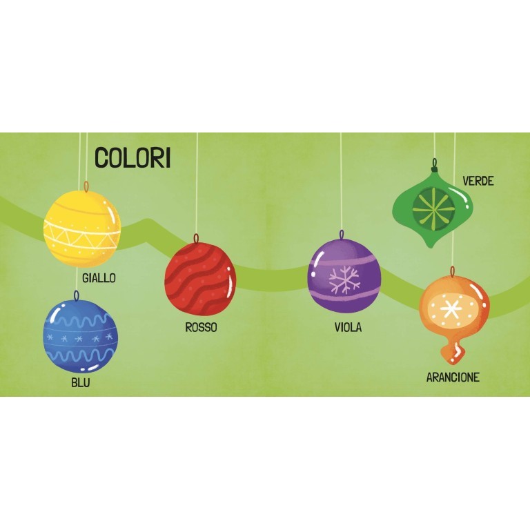 Una scatola abbellita con dettagli iridescenti che contiene un libro di 10 pagine, un puzzle di 40 pezzi e 10 figurine sagomate del Natale da assemblare e posizionare sul al puzzle, per imparare a riconoscere e ad associare elementi e parole.