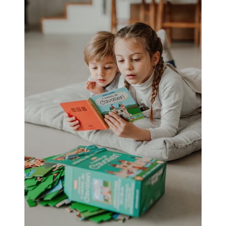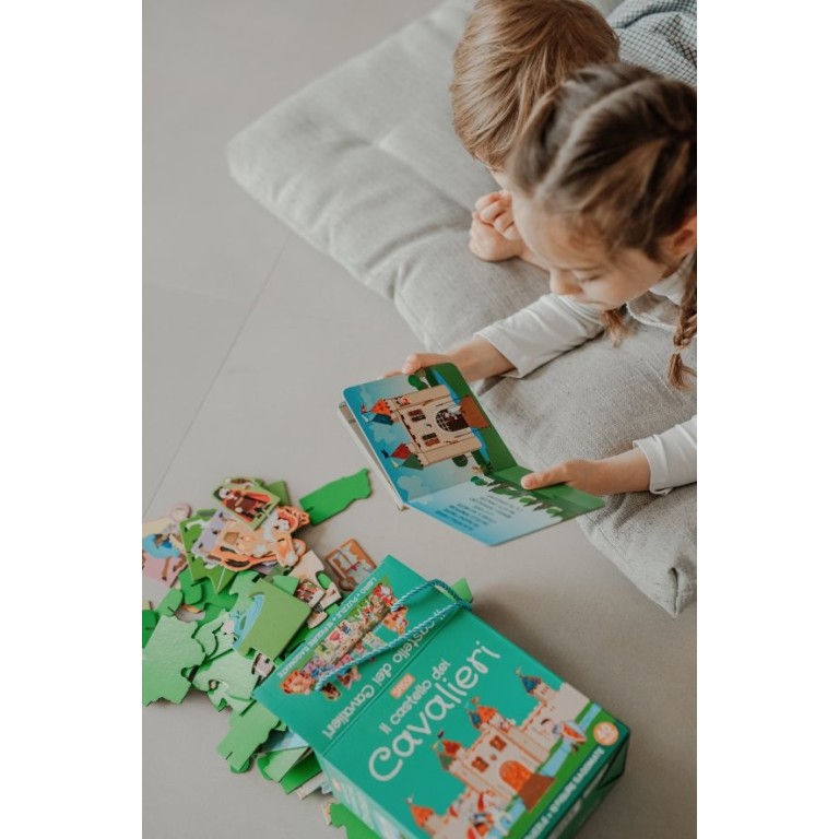 Una scatola con dettagli iridescenti che contiene un libro di 10 pagine, un puzzle di 40 pezzi e 12 figurine sagomate da assemblare e appoggiare sopra al puzzle, per imparare a riconoscere e ad associare elementi e parole.