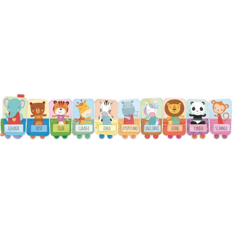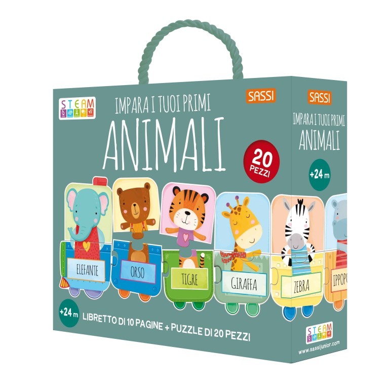 Un libro di 10 pagine e un puzzle di 20 pezzi giganti per creare un trenino e conoscere gli animali.