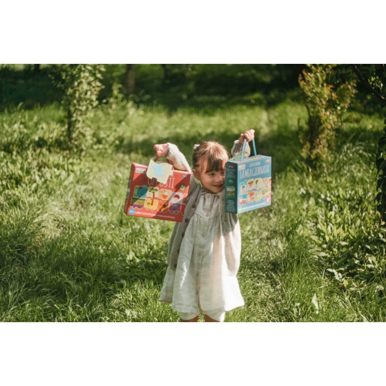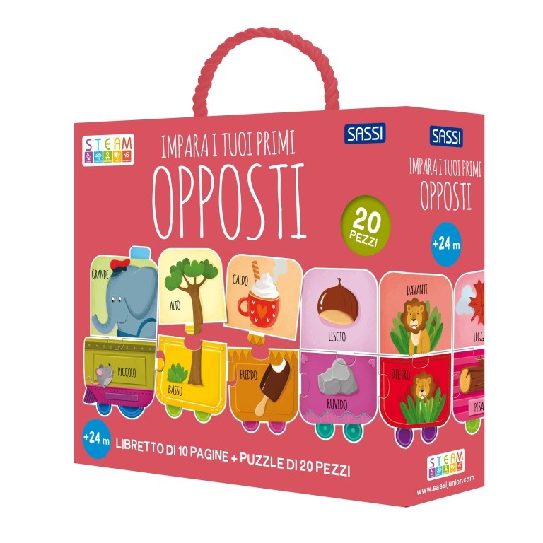Un libro di 10 pagine e un puzzle di 20 pezzi giganti per creare un trenino in grado di stimolare l’apprendimento degli opposti. Il trenino misura un metro di lunghezza!