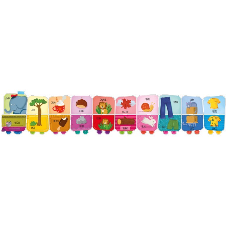 Un puzzle lungo un metro da abbinare a coppie, per imparare nuovi aggettivi contrari. Perfetto per espandere il vocabolario dei più piccoli.