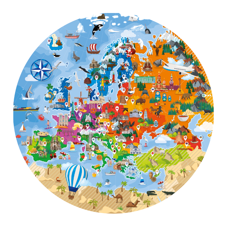 A puzzle and a book filled with facts that will transport the reader on a journey through different European countries.