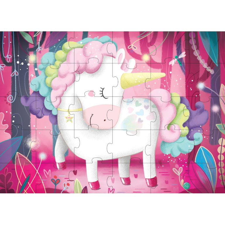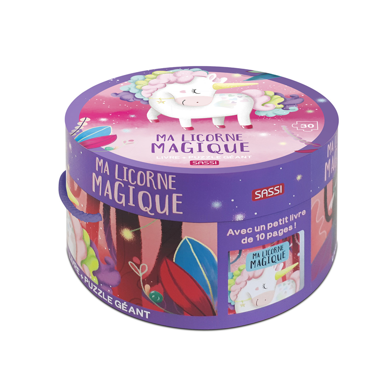 Une boîte ronde contenant un puzzle et un livre amusant en rimes sur les licornes, des créatures magiques et légendaires.