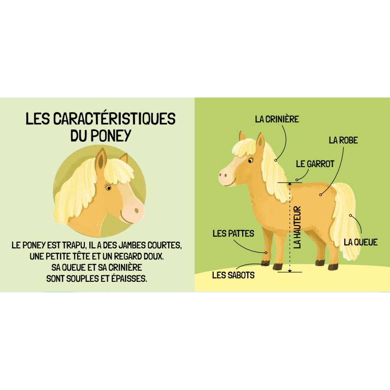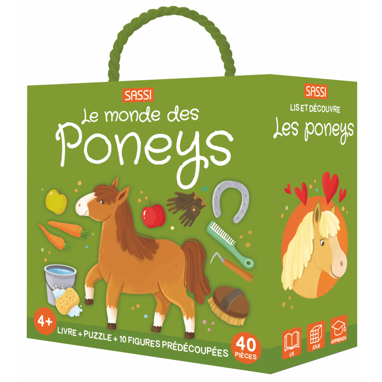 Apprends un tas des choses sur le monde des poneys ! Feuillete le livre, construis le puzzle et apprends de nombreuses informations sur cette espèce curieuse et sympathique.
