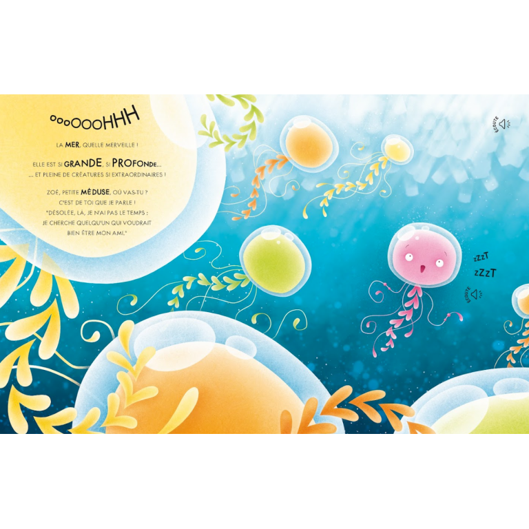 Une petite méduse un peu tête en l’air se balade dans les vagues. Laisse-toi emporter par cette histoire passionnante remplie de créatures marines et de coraux multicolores.